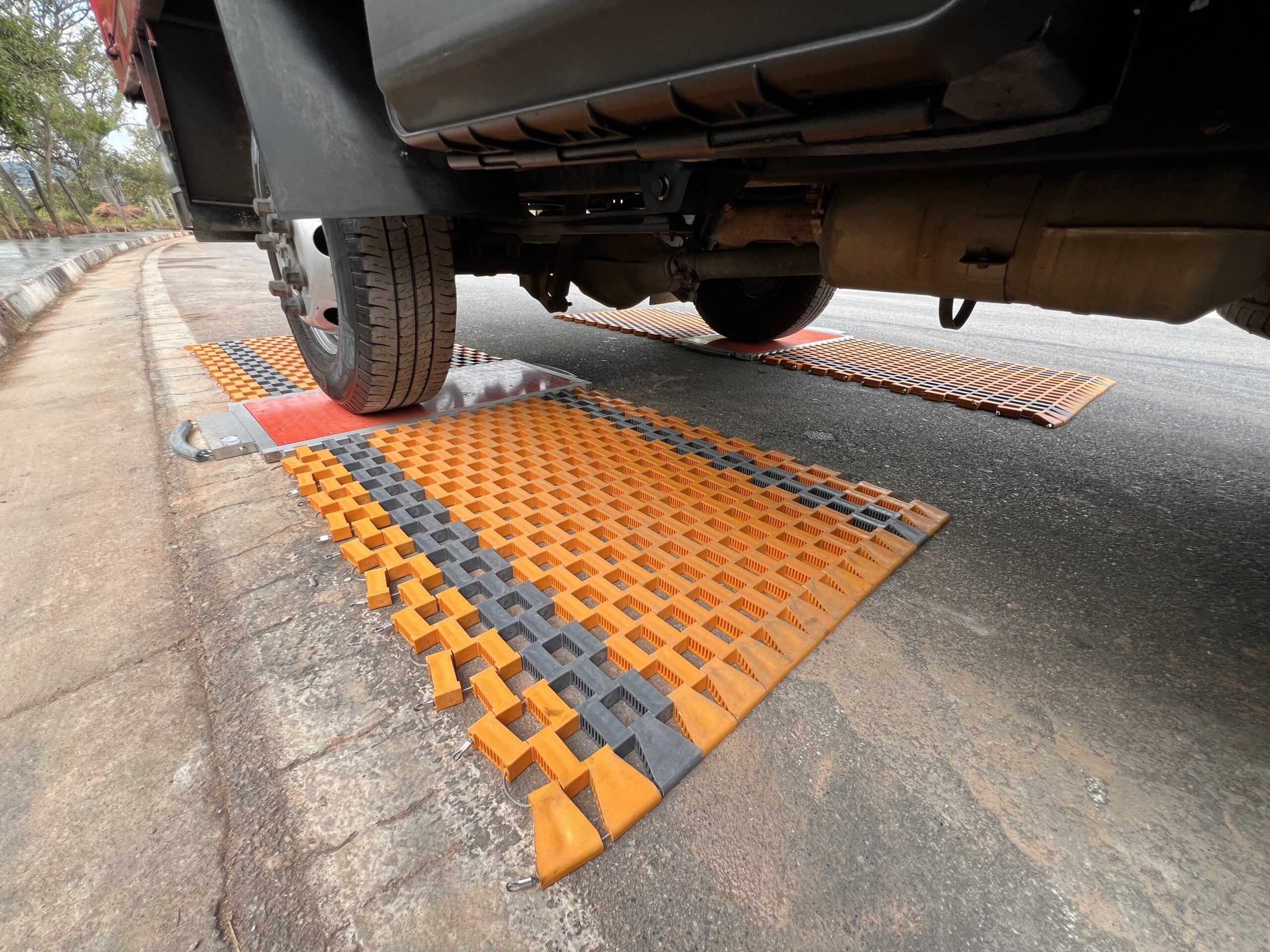 Ao contrário das grandes balanças rodoviárias, ela é composta por plataformas modulares ultra-finas que ficam apoiadas diretamente sobre o piso. O veículo passa ou estaciona sobre elas, e os sensores internos calculam o peso de cada eixo, somando posteriormente o peso total do veículo.
