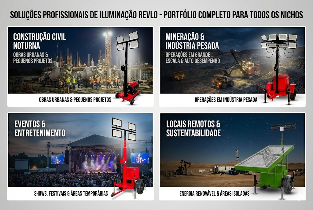As torres de iluminação móvel são muito importantes em vários setores. Elas oferecem iluminação eficaz e confiável. A Revlo atende a muitos clientes com suas torres, que são feitas para atender às necessidades de cada setor.